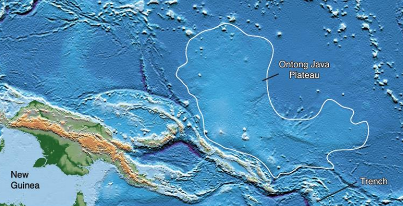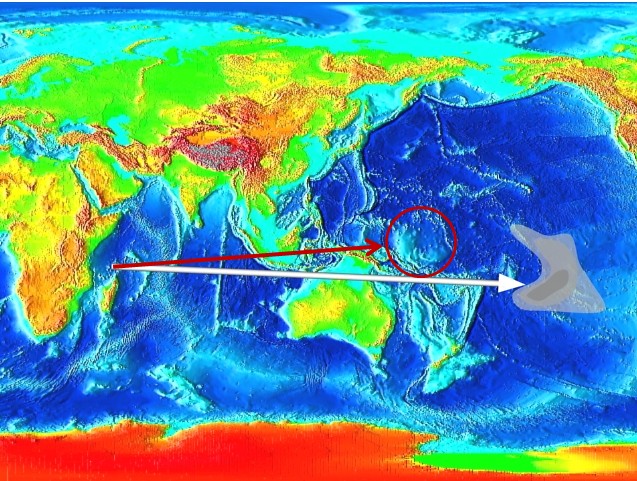 To my knowledge, hydrodynamic code (hydrocode) simulations on supercomputers have not been used to study the antipodal effects of oblique impacts. However, it is possible to produce a pattern similar to the Sandia Lab's hydrocode simulation of a vertical impact by using an animation program to perform a simple dynamics simulation. Spherical particles launched in streams from 4 emitters reflect off the inside wall of a cylinder. Except for straight versus arced trajectories, the result is a good match for waves outside the core. Shifting the emitters slightly (4 degrees) to simulate the off-center energy focus of an oblique impact angle produces this result: The energy focuses at a new antipodal axis (left black triangle) that is closer to the meteorite along its incoming direction. This simulation and the hydrocode simulation both assume a uniform mantle for simplicity. The actual mantle is heterogeneous, with pockets of varying composition and density.6,8,11,12 This should cause the wave energy to lose some of its focus and affect a broader area. Seismic tomography allows us to look deep into the Earth, though the images differ according to the methods researchers use to interpret the data. There are two particularly large regions with slow seismic velocities (considered "hot" or "wet") which led to the proposal that "superplumes" rise from the outer core of the Earth. One is under eastern and southern Africa; the other (red-orange below) is centered roughly on the islands of French Polynesia in the Pacific. The South Pacific Superswell is the surface feature, and it looks like a good candidate for antipodal focused energy from the Shock Dynamics meteorite impact. Geologists have not been able to determine its origin. Some believe it to be a cluster of at least 6 small plumes,9 leading to speculation that the southern part "may be related to a rising superplume which has been delayed in the transition zone and then initiated the secondary plumes", whereas the northern part "could also be related to another superplume which is now going down but which was coming up 30-90 million years ago".1 Clearly it is an unusual feature. QRLW8, 210 km. Anelastic 3D model of the upper mantle from full seismogram waveform inversion. From: Yuancheng Gung and Barbara Romanowicz, "Q tomography of the upper mantle using three component long period waveforms", Geophys. J. Int., 157, 813-830 (2004). In the next picture, the dot is the exact antipode of the Shock Dynamics crater north of Madagascar. The gray shape is the South Pacific Superswell.1 The highest terrain, up to 680 meters, is in the dark gray part of the lower portion. The Superswell is slightly closer to the impact crater, consistent with the oblique simulation. The arrow shows how the Superswell is also in line with the meteorite's ESE azimuth. So the South Pacific Superswell is not only the right size but in the right place to be antipodal disruption by the Shock Dynamics giant meteorite impact. Yet there is another candidate downrange, a third of the distance around the world from the Shock Dynamics giant meteorite impact - the Ontong Java Plateau. Clearly, the Ontong Java Plateau partially obstructed the northern edge of the shock wave that ended as the Tonga-Kermadec Trench. Like the South Pacific Superswell, its distorted semi-circular shape might have resulted from the transmission of pressure waves along oblique paths through the Earth. If so, it surfaced shortly before the shock wave passed. "On Earth, the largest known flood basalt province is the Ontong Java Plateau (OJP)." "Extending beneath the OJP about 300 km into the mantle is a low-velocity root." "Centered beneath the OJP’s thickest crust,... the root is cylindrical with a diameter of about 745 miles, and is characterized by anomalously slow (about 5%) shear wave velocities. If such velocities were entirely thermal in origin, then the root would be up to 700 degrees Kelvin hotter than surrounding mantle, hot enough to cause continuing volcanism. However, since the OJP shows no evidence of active volcanism, this keel was proposed to more likely represent a chemical heterogeneity." "Shear velocity and attenuation characteristics of the OJP’s anomalous mantle root... rule out a thermal anomaly as its cause, further supporting the idea that the keel represents a chemical heterogeneity." "Taken in total, many geophysical, geodynamic, and geochemical results from the OJP are at odds with various mantle plume models for its origin. The greater OJP cannot be tied convincingly to any hotspot or hotspot track." - Ingle, Stephanie, Millard F. Coffin. 2004. Impact origin for the greater Ontong Java Plateau? Earth and Planetary Science Letters. Vol. 218, pp. 123-134 DOI:10.1016/S0012-821X(03)00629-0 * * * * * * * * References 1. Adam, Claudia, Alain Bonneville. 2005. Extent of the South Pacific Superswell. Journal of Geophysical Research, Vol. 110, B09408, 14 pages. 2. Boslough, M.B., E.P. Chael, T.G. Trucano, D.A. Crawford, D.L. Campbell. 1996. Axial Focusing of Impact Energy in the Earth's Interior: a Possible Link to Flood Basalts and Hotspots. in The Cretaceous-Tertiary Event and Other Catastrophes in Earth History, G. Ryder, S. Gartner, D. Fastovsky (eds.), GSA Special Paper 307, pp. 541-550. 3. Hagstrum, Jonathan T., 2005. Antipodal hotspots and bipolar catastrophes: Were oceanic large-body impacts the cause? Earth and Planetary Science Letters, 236, pp. 13-27. 4. Melosh, H.J. 2000. Can impacts induce volcanic eruptions? International Conference on Catastrophic Events and Mass Extinctions: Impacts and Beyond, Lunar and Planetary Science Institute Contribution 1053, 2 pages. 5. Pierazzo, E., H.J. Melosh. 2000. Understanding Oblique Impacts from Experiments, Observations, and Modeling. Annual Review of Earth and Planetary Science, Vol. 28, pp. 141-167, (Figure 2 - p. 152). 6. Poupinet, Georges, Nicholas Arndt, Pierre Vacher. 2003. Seismic tomography beneath stable tectonic regions a