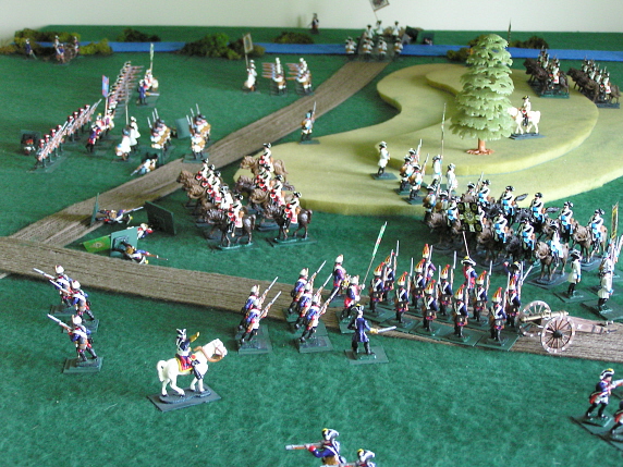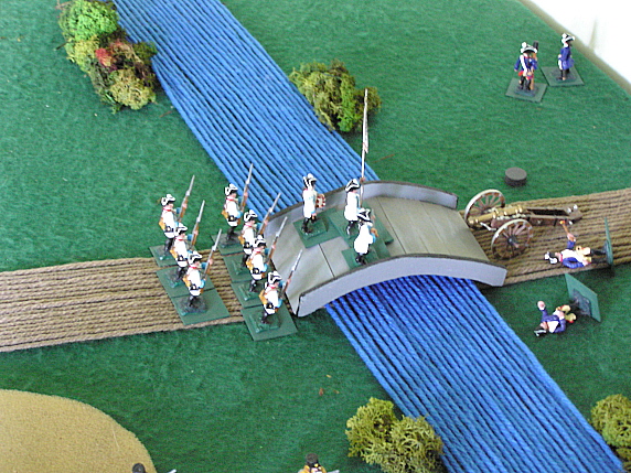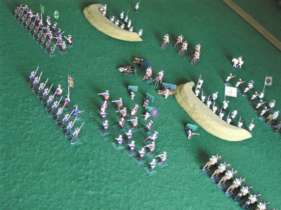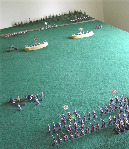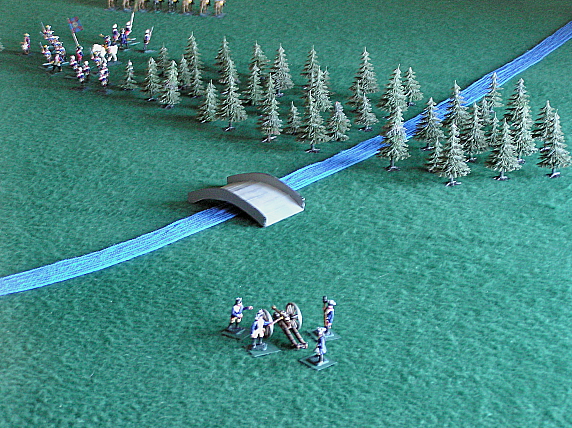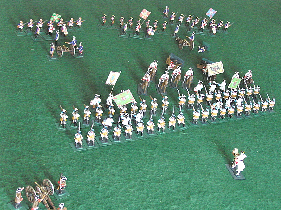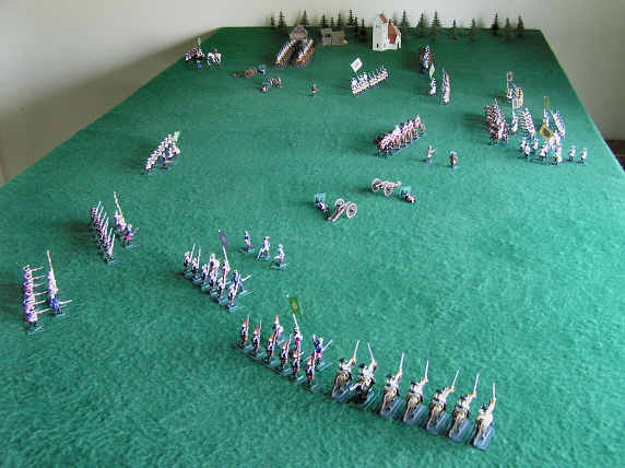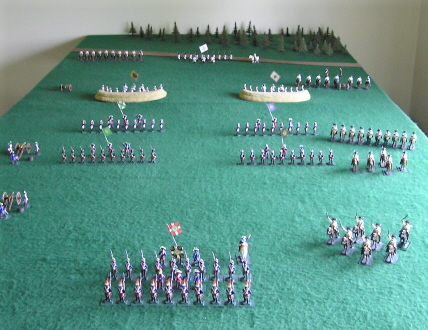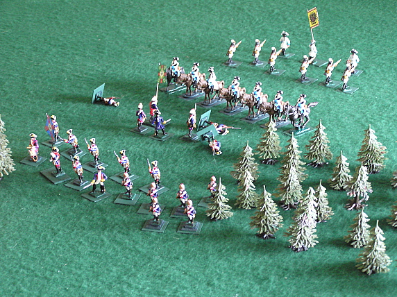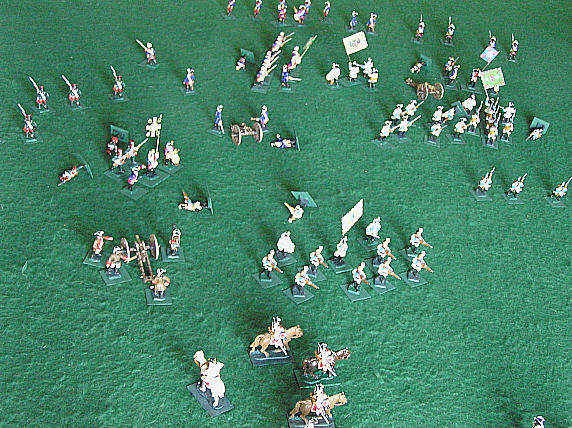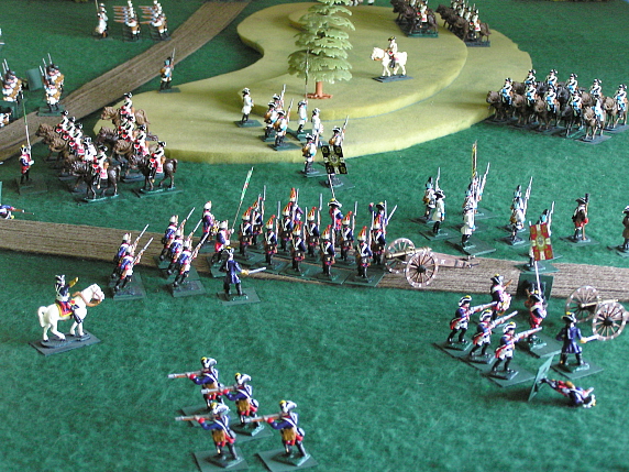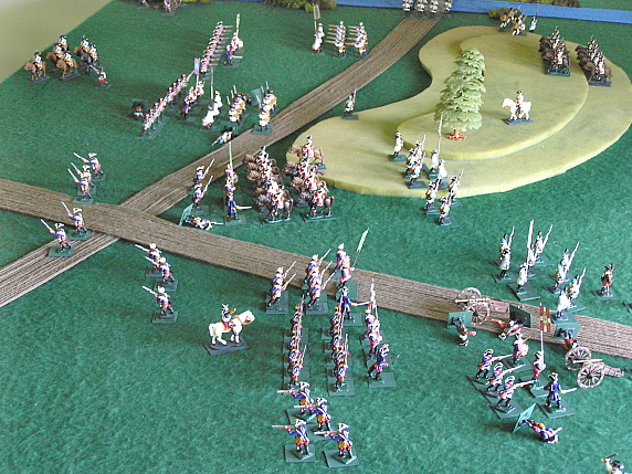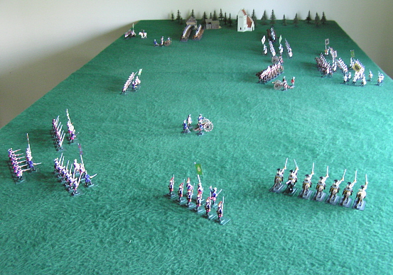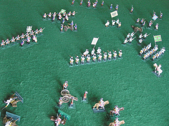 Years ago in England, men such as H. G. Wells and Don Featherstone wrote rules for fast-moving, fun wargames with toy soldiers (military miniatures). They were eventually eclipsed by players who wanted more sophistication and realism in their games. Unfortunately, this led to tedious gaming sessions as enjoyable as calculating your taxes. The rules here are a return to the simple game, with a new way of resolving combat and individual figures rather than groups of men on stands. The "chance" version uses playing cards instead of dice, while the "without-chance" version has automatic combat resolution, and in that sense is more chess-like. The rules work for any number of toy soldiers and are fine for solitaire games. The setup in the rules is for a generic encounter game with terrain objectives, but any scenario, including victory through routing the opposing force, will work as well. Players may add rules for more realism at their own peril. Here is a small battle to illustrate what can happen. After that, you can find the rule sets and three larger sample battle reports. Advance Guard A large Prussian army is on the move. Ahead of it is an advance guard under General Kreytzen. He has two infantry units and one unit each of cavalry and artillery. As they approach a bridge crossing the unfordable river Protz, they see an Austrian cavalry unit in line on the other side. The Austrians have detachments watching a number of the Protz bridges. This detachment is commanded by General Hadik. He is bivouacked with two infantry units near a farm, and comes up to look when he gets a report from the cavalry. Hadik has orders to prevent, or at least delay, any Prussian advance beyond the bridge. Kreytzen brings up his artillery to threaten the Austrian cavalry. Hadik pulls them back from the line of fire. Hadik has determined that he can hold a narrow gap in the woods with his small force. He puts his cavalry in position to attack the flank of Prussian units that advance through the gap, and moves his infantry towards the gap in columns. Kreytzen sees the importance of getting past the gap before it is blocked. He sends his cavalry into it, and brings his fusilier infantry unit across the bridge. Despite the approaching enemy infantry, Kreytzen boldly charges the Austrian cavalry. He hopes it will buy time to allow his infantry to advance beyond the gap. The Prussian cavalry are getting the best of the Austrians. Hadik decides he needs to deploy his first infantry unit to deal with the Prussian cavalry should they win. The Prussian cavalry succeed in routing the Austrian cavalry, but Hadik marches his infantry unit into their flank. One volley sends the Prussian cavalry running. But Kreytzen was able to deploy his fusiliers beyond the gap. Hadik moves his two infantry units forward to engage the Prussian fusiliers. Kreytzen rushes his second infantry unit across the bridge, concerned it might not get there in time to support the fusiliers. The Prussians fight well, and begin to get the upper hand on the Austrian infantry. The intrepid fusiliers dispatch the first Austrian infantry unit, and deal blows to the second one. But they are down to only a few men in ranks. Even so, Kreytzen can hardly believe his good fortune. His second infantry unit has arrived, and it has to deal with only one battered Austrian infantry unit. Hadik quickly rallies his cavalry. The Prussian infantry charge past the fusiliers, and send the Austrian infantry running. Hadik sees everything falling apart. As his last hope, he sends his rallied cavalry unit charging into the victorious Prussian infantry unit. The Prussians are caught completely by surprise. The ones who are not cut down run away. Now only the tattered few fusiliers remain to hold the gap. Kreytzen sees victory slipping away. There is no time to bring up the artillery; he rallies his cavalry. As Kreytzen leads the cavalry towards the gap, he can't believe his eyes. The fusiliers have stood their ground! The last of the Austrian cavalry join their routing infantry. Hadik sees he has lost the battle for the gap, and starts to rally his second infantry unit to cover his withdrawal. He has obeyed his orders to delay the Prussian advance. The Prussian cavalry chase the Austrians back towards the farm. Kreytzen happily begins to rally both his infantry units, thinking how he is going to honor the fusiliers for their amazing work in this fight. Of the forces engaged, Austrian casualties were 39%; Prussian casualties were 25%. The artillery did not get into action.