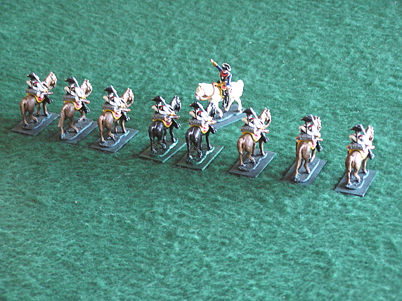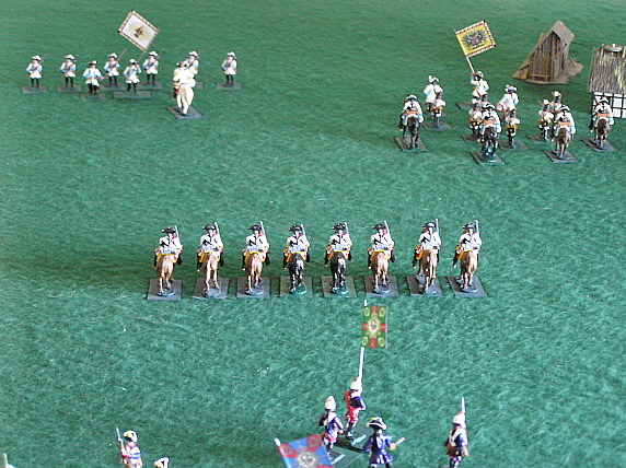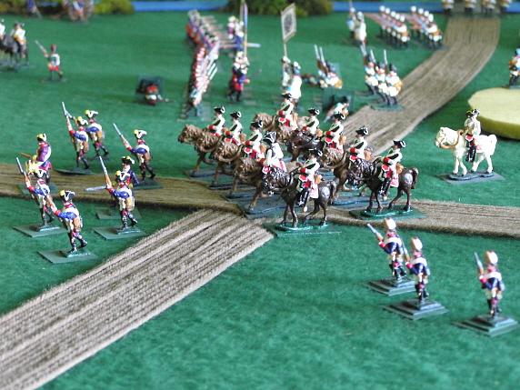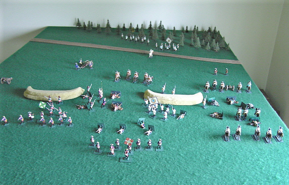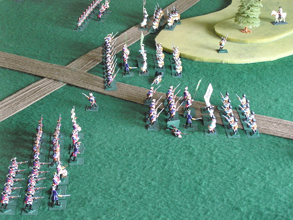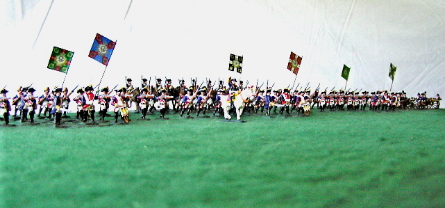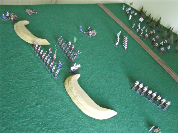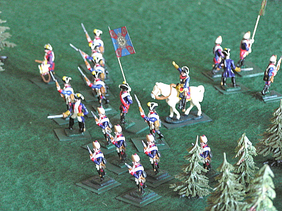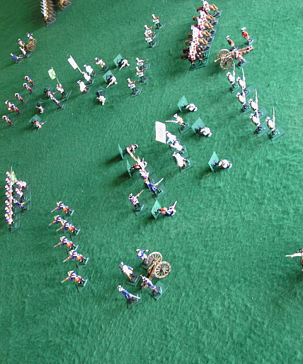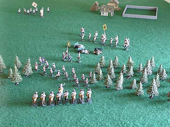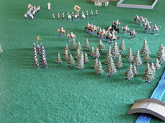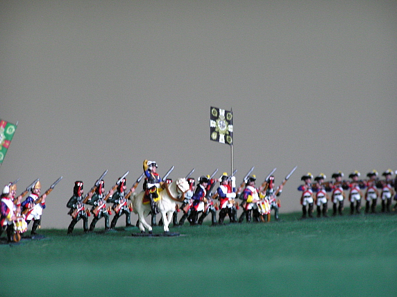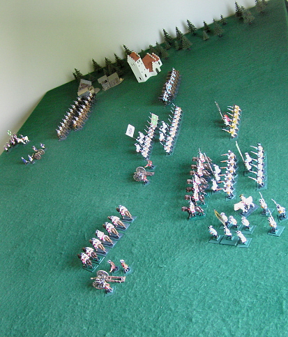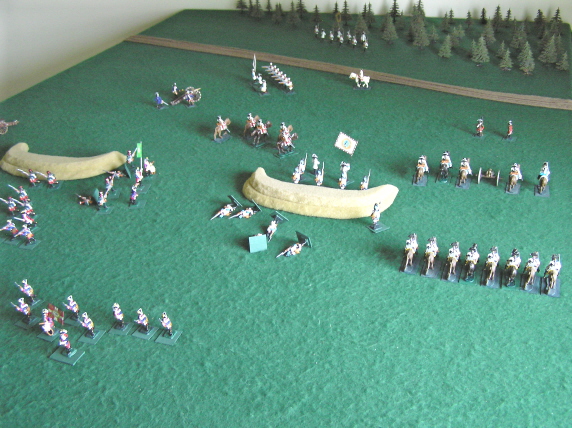 Years ago in England, men such as H. G. Wells and Don Featherstone wrote rules for fast-moving, fun wargames with toy soldiers (military miniatures). They were eventually eclipsed by players who wanted more sophistication and realism in their games. Unfortunately, this led to tedious gaming sessions as enjoyable as calculating your taxes. The rules here are a return to the simple game, with a new way of resolving combat and individual figures rather than groups of men on stands. The "chance" version uses playing cards instead of dice, while the "without-chance" version has automatic combat resolution, and in that sense is more chess-like. The rules work for any number of toy soldiers and are fine for solitaire games. The setup in the rules is for a generic encounter game with terrain objectives, but any scenario, including victory through routing the opposing force, will work as well. Players may add rules for more realism at their own peril. Here is a small battle to illustrate what can happen. After that, you can find the rule sets and three larger sample battle reports. Advance Guard A large Prussian army is on the move. Ahead of it is an advance guard under General Kreytzen. He has two infantry units and one unit each of cavalry and artillery. As they approach a bridge crossing the unfordable river Protz, they see an Austrian cavalry unit in line on the other side. The Austrians have detachments watching a number of the Protz bridges. This detachment is commanded by General Hadik. He is bivouacked with two infantry units near a farm, and comes up to look when he gets a report from the cavalry. Hadik has orders to prevent, or at least delay, any Prussian advance beyond the bridge. Kreytzen brings up his artillery to threaten the Austrian cavalry. Hadik pulls them back from the line of fire. Hadik has determined that he can hold a narrow gap in the woods with his small force. He puts his cavalry in position to attack the flank of Prussian units that advance through the gap, and moves his infantry towards the gap in columns. Kreytzen sees the importance of getting past the gap before it is blocked. He sends his cavalry into it, and brings his fusilier infantry unit across the bridge. Despite the approaching enemy infantry, Kreytzen boldly charges the Austrian cavalry. He hopes it will buy time to allow his infantry to advance beyond the gap. The Prussian cavalry are getting the best of the Austrians. Hadik decides he needs to deploy his first infantry unit to deal with the Prussian cavalry should they win. The Prussian cavalry succeed in routing the Austrian cavalry, but Hadik marches his infantry unit into their flank. One volley sends the Prussian cavalry running. But Kreytzen was able to deploy his fusiliers beyond the gap. Hadik moves his two infantry units forward to engage the Prussian fusiliers. Kreytzen rushes his second infantry unit across the bridge, concerned it might not get there in time to support the fusiliers. The Prussians fight well, and begin to get the upper hand on the Austrian infantry. The intrepid fusiliers dispatch the first Austrian infantry unit, and deal blows to the second one. But they are down to only a few men in ranks. Even so, Kreytzen can hardly believe his good fortune. His second infantry unit has arrived, and it has to deal with only one battered Austrian infantry unit. Hadik quickly rallies his cavalry. The Prussian infantry charge past the fusiliers, and send the Austrian infantry running. Hadik sees everything falling apart. As his last hope, he sends his rallied cavalry unit charging into the victorious Prussian infantry unit. The Prussians are caught completely by surprise. The ones who are not cut down run away. Now only the tattered few fusiliers remain to hold the gap. Kreytzen sees victory slipping away. There is no time to bring up the artillery; he rallies his cavalry. As Kreytzen leads the cavalry towards the gap, he can't believe his eyes. The fusiliers have stood their ground! The last of the Austrian cavalry join their routing infantry. Hadik sees he has lost the battle for the gap, and starts to rally his second infantry unit to cover his withdrawal. He has obeyed his orders to delay the Prussian advance. The Prussian cavalry chase the Austrians back towards the farm. Kreytzen happily begins to rally both his infantry units, thinking how he is going to honor the fusiliers for their amazing work in this fight. Of the forces engaged, Austrian casualties were 39%; Prussian casualties were 25%. The artillery did not get into action.