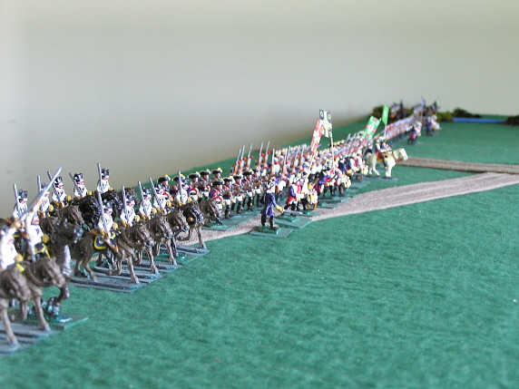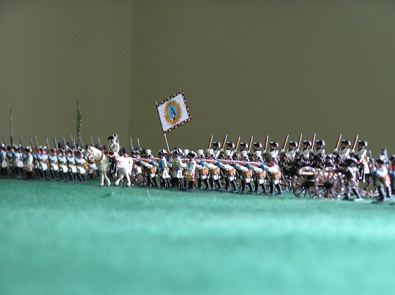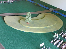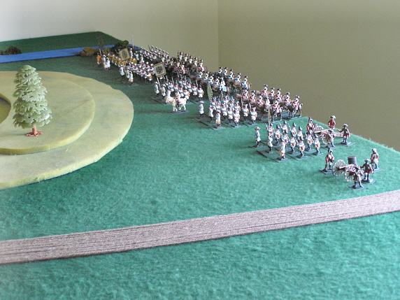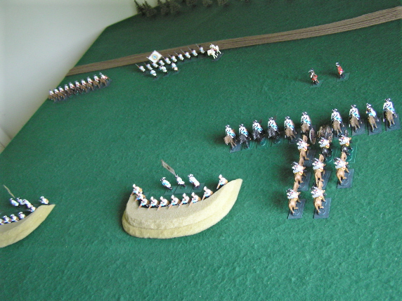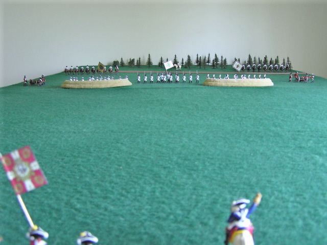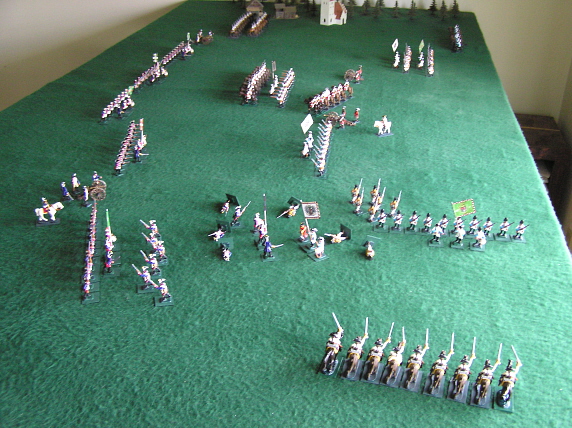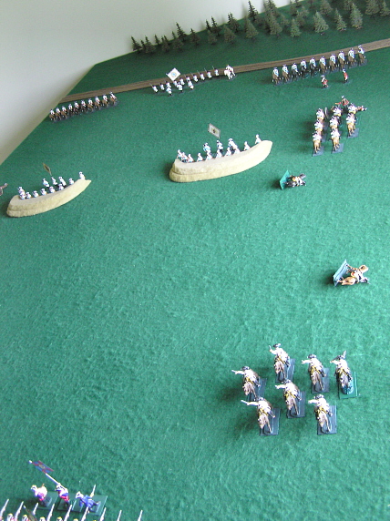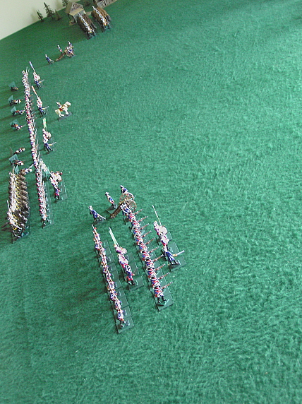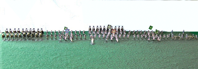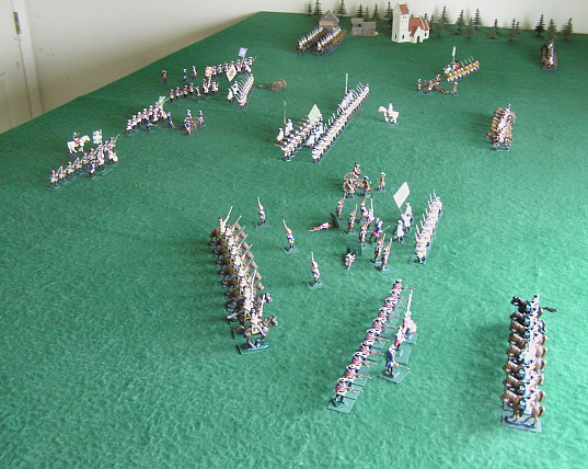A battle with the chance version This battle will again pit Prussian and Austrian armies of the Seven Years War against each other on an open field, this time to illustrate the Blown Away rules, chance version. To reduce clutter, playing cards that are used to resolve engagements are kept off the table. Each side has the same number and types of troops. The figures are Hinchliffe 25mm. Battle plans are the same as before: the Prussian commander, Ziethen, has reinforced his flanks, while the Austrian commander, Lascy, has strengthened his center, and each will attack where they are strong. As the commanders advance their units, they exchange long range artillery fire to weaken enemy units they intend to attack. Ziethen sees that his center will not hold against the Austrian concentration. So he postpones his flank attack in order to hurry both his cannon to the center. Lascy attacks the right cannon with cavalry. They do some damage, but are repulsed. Lascy recovers his cavalry and sends in an infantry unit. It overruns the cannon and attacks the infantry. Meanwhile, Ziethen has resumed his advance on the right flank. The Prussian grenadiers are repulsed by the Austrian infantry, but Ziethen's cavalry follows up and scatters the Austrians. The Prussian infantry rout the Austrian cavalry unit, leaving Ziethen in control of the right flank. He stops to rally his victorious units. To buy some time for his main assault, Lascy sends the rallied cavalry unit toward his open left flank. He regrets having to reduce his center forces. In the center, the Austrian infantry routs the Prussian unit after a hard fight. Lascy engages another Prussian unit with his second center-right infantry unit. This unit fights well, but in the end is repulsed. Lascy has committed himself to an attack on the center, so he puts a center-left infantry unit in column formation and directs it to attack the weakened Prussian unit. On his right flank, Ziethen attacks the newly arrived Austrian cavalry unit with his rallied cavalry. They cause casualties, but the Prussians are repulsed. So Ziethen attacks the few remaining Austrian cavalrymen with his rallied infantry unit. The Austrian cavalry fight amazingly well. In fact, they repulse the infantry! Although only one lone Austrian cavalryman remains in ranks, all the right-flank Prussian units are routed. As they say, "in the land of the blind, a one-eyed man is king". Lascy can rally the cavalry unit, but the routed Prussian units must begin a turn 24 inches away from an enemy unit in ranks before they can start to rally. That is often the deciding factor that determines which armies win or lose battles with these rules. In the center, Ziethen moves up an infantry unit and artillery against the remaining Austrian center-left infantry unit. The artillery sends the Austrians running. Lascy pushes his cannon forward to engage the battered Prussian infantry unit; the Prussians are routed. Ziethen rallies the artillerymen who have just performed so admirably, and pushes his cannon towards the Austrian gun to engage it. The Austrian gun prevails. Lascy begins to rally his remarkable left-flank cavalry unit. Once they are rallied, he sends the cavalry to the middle of the field on the left flank, leaving the Prussians no place to rally their routed units on that flank. Seeing that his main effort on the right flank has failed miserably, Ziethen attempts to crush the last vestige of the Austrian assault on the center by putting a left-flank cavalry unit in column and moving it and a center infantry unit against the remaining Austrian infantry there. It is clear that Ziethen's bolstering of his center with artillery early on made a big difference. The Austrian infantry is routed. Surprisingly, the main efforts by both commanders have failed. The Austrians control their left flank, and the Prussians control the center! But the Austrians have units in positions that prevent Prussian units from rallying. Ziethen's hope for victory now rests on defeating the Austrians on his left flank. He had weakened the enemy cavalry and infantry there early in the battle with long-range artillery fire. The Prussians attack the Austrian cavalry as Lascy hurries to rally an infantry unit. The cavalry attack begins to falter. Ziethen throws an infantry unit against the Austrian artillery, but the rallied Austrian infantry unit is coming on. The Prussian cavalry routs, and Ziethen's hopes fade. His infantry has overrun the artillery, but now the Austrian infantry unit is engaged. The Prussian infantry fight hard, but the larger Austrian infantry unit prevails. It is over. Lascy has four units in hand and more in position to be rallied. Ziethen has only two organized units left and cannot rally others, so he withdraws his men. Lascy is left with the field and Ziethen's cannon, but his forces are too mauled to mount a pursuit. Casualties on both sides were 35%. John Michael Fischer