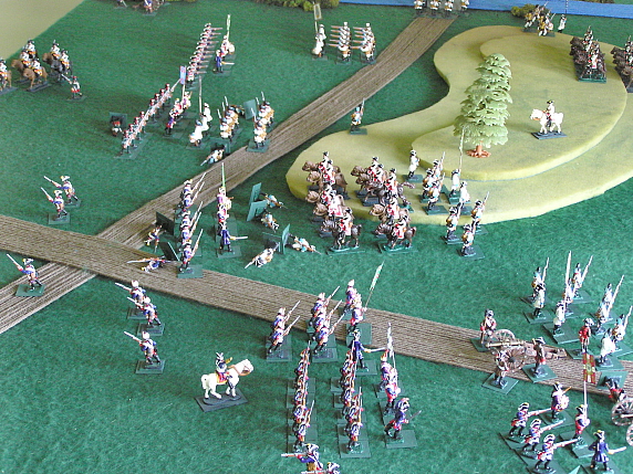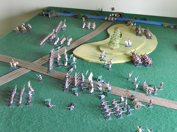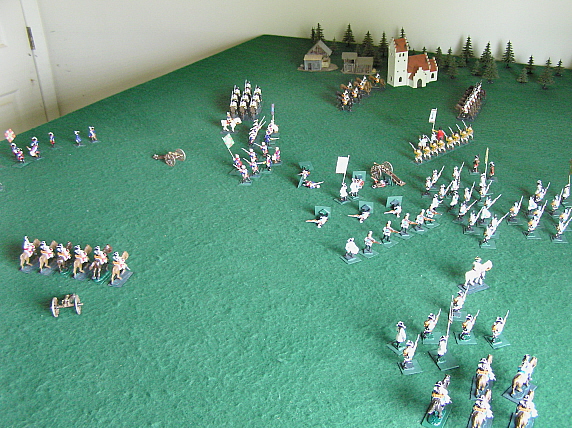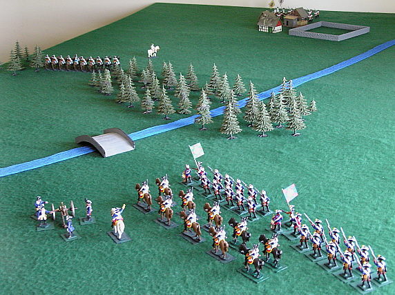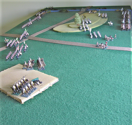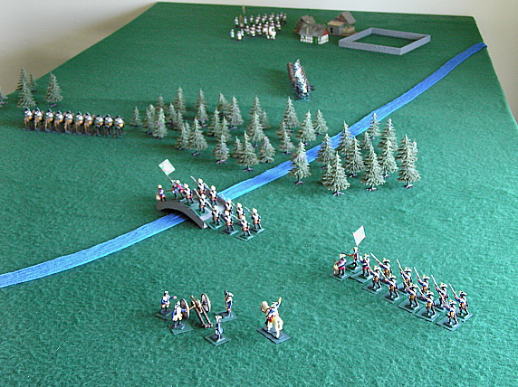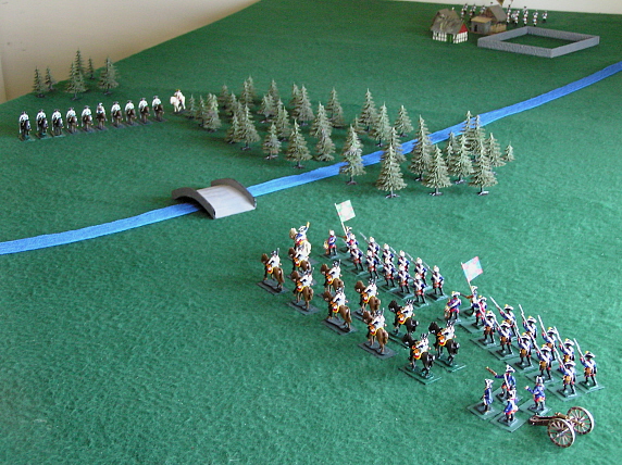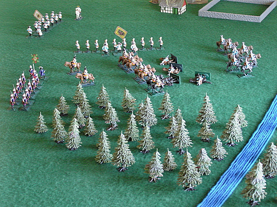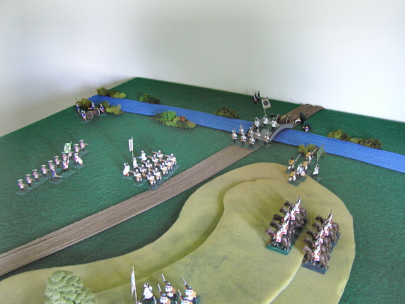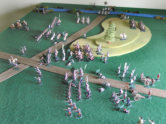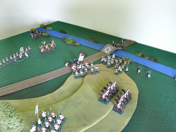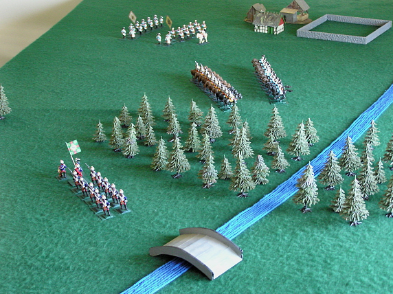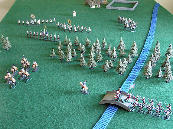 Each objective is somewhat off-center, but overall neither long side has an advantage. The forces are equal. Players write their deployments in secret, then place their troops. Prussian general Finck has deployed so as to quickly take the crossroads and wheatfield. Austrian general von Pach is in position to overwhelm the hill and bridge. Finck has placed artillery on both sides of the river to make it costly for the Austrians to capture the bridge. The bulk of his force is arrayed far beyond the Austrian flank. With the cavalry on the outside, he plans to hold the crossroads, sweep across the wheatfield and envelop the hill. If he can force the Austrians back against the river, they will have nowhere to rally routing units. Von Pach realizes that he must move fast; a protracted fight would find his force boxed in. But three objectives are within reach. He plans to rush the hill, and from there expand to take the bridge and crossroads. He hopes his artillery can delay a Prussian flank attack. The Prussians begin their sweep from the crossroads to the wheatfield. The Austrian left flank pushes forward to meet them, and Austrian infantry marches onto the hill. Prussian long-range artillery fire begins picking off Austrian Pandours advancing towards the bridge. Finck cannot resist charging the isolated and depleted Pandours with his left flank cavalry. If he can beat them and recover quickly, he could take the bridge and win the game. The Pandours do not put up much of a fight, and von Pach sees the danger. He sends another infantry unit towards the bridge. In response, Finck moves the artillery on the far side of the river towards the bridge. The Pandours run, but before they can rally the Prussian cavalry are charged by Austrian infantry coming over the hill. The cavalry rout. Prussian artillery and Austrian infantry have both reached the bridge and are contesting it. In the fight for the bridge, the Prussian gunners are swept away. Von Pach leaves more than enough units nearby to discourage the Prussians from any further attempts on the bridge. Finck is disappointed over the lost opportunity, but still feels confident in his plan. On Finck's right flank, the first Prussian cavalry unit, depleted by long-range Austrian artillery fire, fails to dislodge the Austrian battery. However, the second cavalry unit is poised to strike. The steely Austrian gunners repulse the second charge too! Finck had hoped to put the Austrian flank into chaos and then assault the hill, but the flank has held. Now it is up to the Prussian infantry. Von Pach takes the initiative. He sends his infantry forward to check the Prussians near the crossroads. The Prussians are out of cavalry, whereas von Pach has all three of his cavalry units available. He intends to hurl them at the crossroads. Finck sees he must break the Austrian infantry quickly, and in fact his men are getting the upper hand. Just as the Prussians win the infantry contest at the crossroads, Austrian cavalry rides into the melee. The Prussian fusiliers and grenadiers rout the Austrian infantry before them. The way is open for the Prussians to flank the cavalry and advance on the hill. Von Pach pushes his second artillery unit forward to engage the fusiliers and grenadiers. The Prussian infantry mow down the Austrian gunners, but the fight is on at the crossroads. The Prussian infantry at the crossroads are collapsing before the Austrian cavalry. Finck orders his grenadiers to swing left across the road and charge the cavalry. Von Pach launches his second cavalry unit forward to block the grenadiers. The last of the Prussian infantry defending the crossroads fall. "It is appropriate that they lost their colors", Finck grumbles to himself. "They did not take down even one of the Austrian riders." The Prussians have no reserves left, and the second Austrian cavalry unit has thundered onto the scene to stop the advance of the Prussian grenadiers. The first Austrian cavalry unit takes the crossroads uncontested, giving von Pach his third objective and the win. The loss of Prussian cavalry units in failed attempts to exploit early opportunities left Finck unable to adequately defend against a concentrated blow. Casualties on both sides were 20 percent.