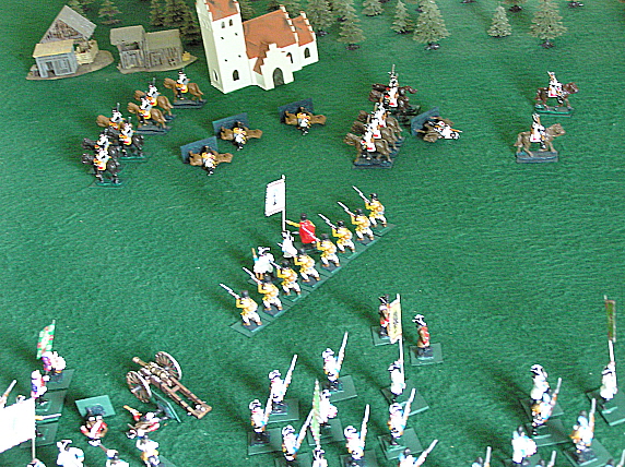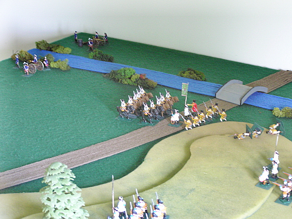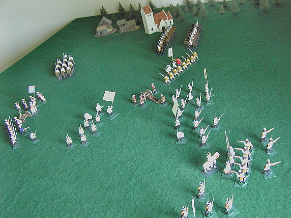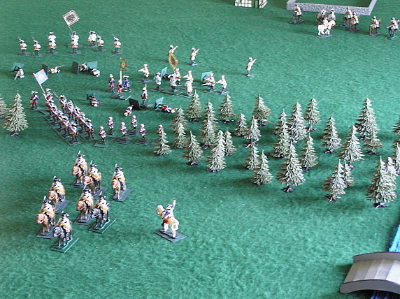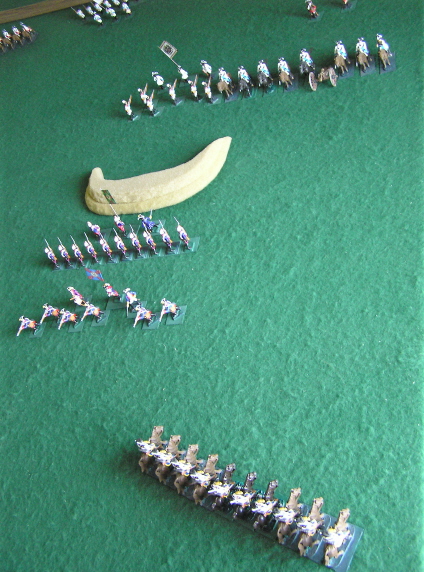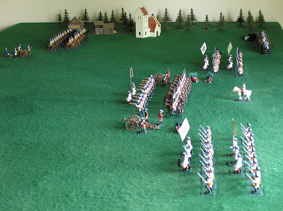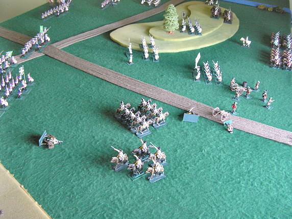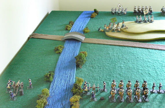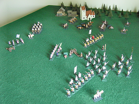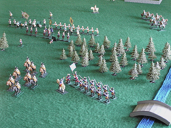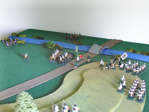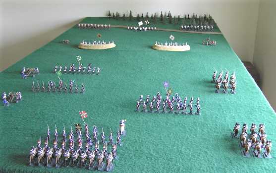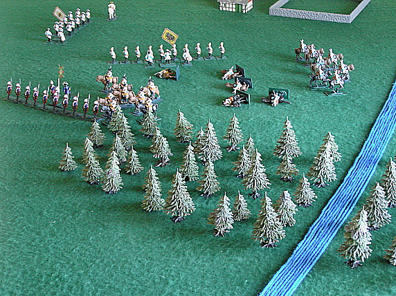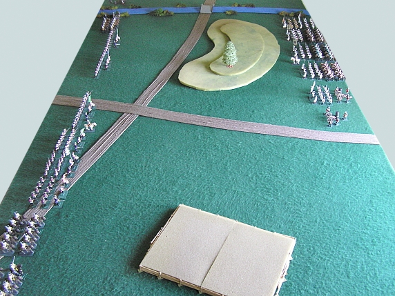 Each objective is somewhat off-center, but overall neither long side has an advantage. The forces are equal. Players write their deployments in secret, then place their troops. Prussian general Finck has deployed so as to quickly take the crossroads and wheatfield. Austrian general von Pach is in position to overwhelm the hill and bridge. Finck has placed artillery on both sides of the river to make it costly for the Austrians to capture the bridge. The bulk of his force is arrayed far beyond the Austrian flank. With the cavalry on the outside, he plans to hold the crossroads, sweep across the wheatfield and envelop the hill. If he can force the Austrians back against the river, they will have nowhere to rally routing units. Von Pach realizes that he must move fast; a protracted fight would find his force boxed in. But three objectives are within reach. He plans to rush the hill, and from there expand to take the bridge and crossroads. He hopes his artillery can delay a Prussian flank attack. The Prussians begin their sweep from the crossroads to the wheatfield. The Austrian left flank pushes forward to meet them, and Austrian infantry marches onto the hill. Prussian long-range artillery fire begins picking off Austrian Pandours advancing towards the bridge. Finck cannot resist charging the isolated and depleted Pandours with his left flank cavalry. If he can beat them and recover quickly, he could take the bridge and win the game. The Pandours do not put up much of a fight, and von Pach sees the danger. He sends another infantry unit towards the bridge. In response, Finck moves the artillery on the far side of the river towards the bridge. The Pandours run, but before they can rally the Prussian cavalry are charged by Austrian infantry coming over the hill. The cavalry rout. Prussian artillery and Austrian infantry have both reached the bridge and are contesting it. In the fight for the bridge, the Prussian gunners are swept away. Von Pach leaves more than enough units nearby to discourage the Prussians from any further attempts on the bridge. Finck is disappointed over the lost opportunity, but still feels confident in his plan. On Finck's right flank, the first Prussian cavalry unit, depleted by long-range Austrian artillery fire, fails to dislodge the Austrian battery. However, the second cavalry unit is poised to strike. The steely Austrian gunners repulse the second charge too! Finck had hoped to put the Austrian flank into chaos and then assault the hill, but the flank has held. Now it is up to the Prussian infantry. Von Pach takes the initiative. He sends his infantry forward to check the Prussians near the crossroads. The Prussians are out of cavalry, whereas von Pach has all three of his cavalry units available. He intends to hurl them at the crossroads. Finck sees he must break the Austrian infantry quickly, and in fact his men are getting the upper hand. Just as the Prussians win the infantry contest at the crossroads, Austrian cavalry rides into the melee. The Prussian fusiliers and grenadiers rout the Austrian infantry before them. The way is open for the Prussians to flank the cavalry and advance on the hill. Von Pach pushes his second artillery unit forward to engage the fusiliers and grenadiers. The Prussian infantry mow down the Austrian gunners, but the fight is on at the crossroads. The Prussian infantry at the crossroads are collapsing before the Austrian cavalry. Finck orders his grenadiers to swing left across the road and charge the cavalry. Von Pach launches his second cavalry unit forward to block the grenadiers. The last of the Prussian infantry defending the crossroads fall. "It is appropriate that they lost their colors", Finck grumbles to himself. "They did not take down even one of the Austrian riders." The Prussians have no reserves left, and the second Austrian cavalry unit has thundered onto the scene to stop the advance of the Prussian grenadiers. The first Austrian cavalry unit takes the crossroads uncontested, giving von Pach his third objective and the win. The loss of Prussian cavalry units in failed attempts to exploit early opportunities left Finck unable to adequately defend against a concentrated blow. Casualties on both sides were 20 percent.
