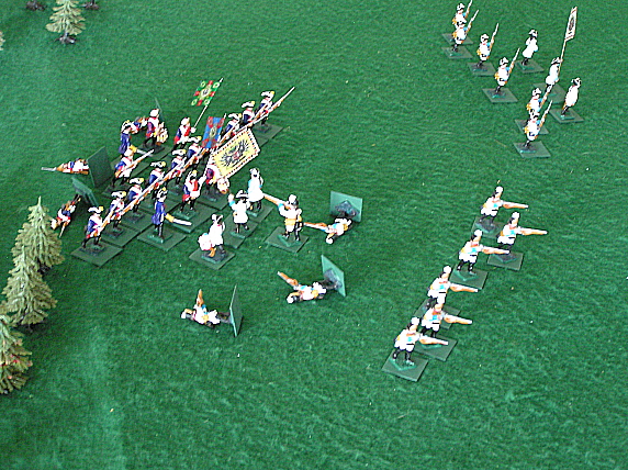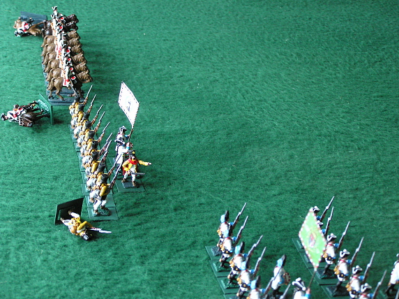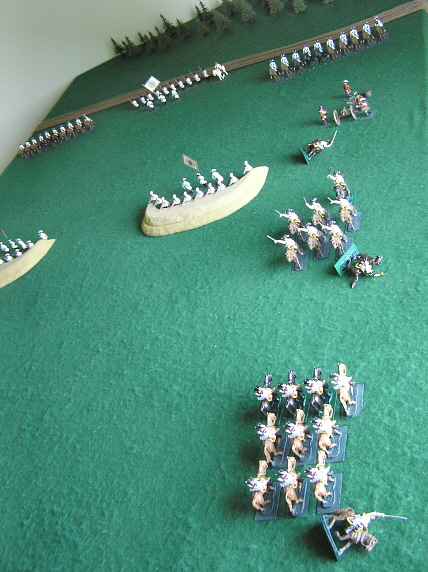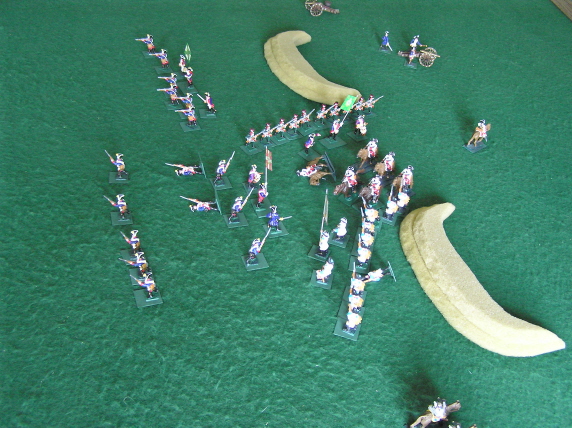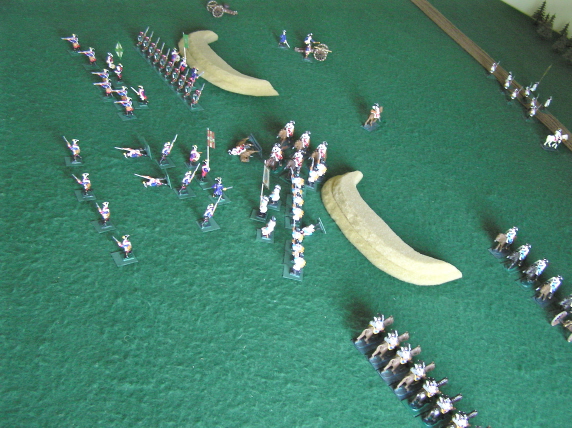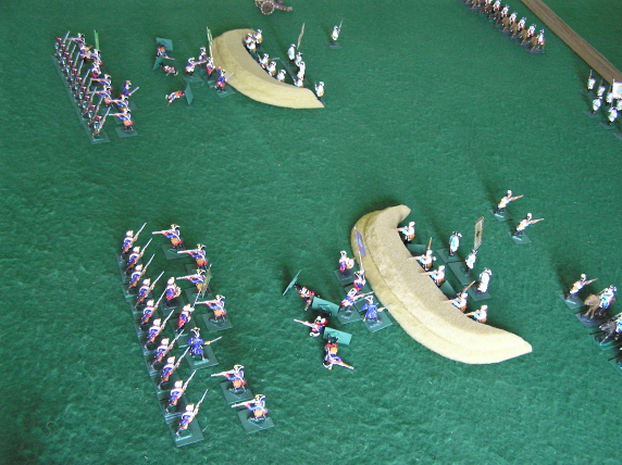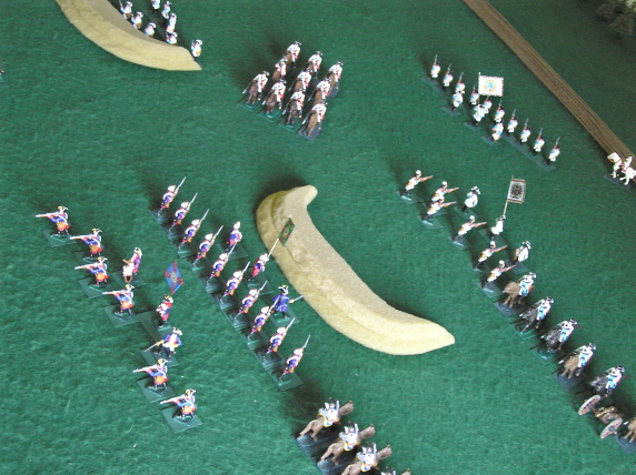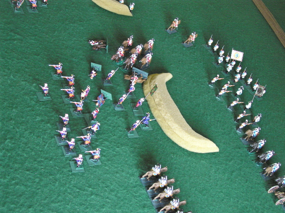 After combat, if any men in ranks remain in an engaged enemy unit that is facing the cavalry, all remaining cavalrymen in ranks run 6 inches. This is cavalry's weakness. So if a 10-man cavalry unit fights a 13-man infantry unit, each side loses 1 man killed; 1 cavalryman runs and 10 infantrymen run. Since 2 infantrymen remain in ranks, the other 8 cavalrymen run too. This also applies when a cavalry unit is engaged with (within 4 inches of) more than one enemy unit that is facing the cavalry. Even though the cavalry fought only one of the enemy units, men in ranks in the other unit(s) that remain after combat cause the cavalrymen to run. End of engagement An engagement usually lasts more than one turn. While it continues, each side may involve additional units. An engagement is over when one or both players have no men in ranks remaining in that particular fight. Return all killed men to the storage tray. Note that as men are killed or run, remaining men in ranks may be more than 4 inches from the enemy they are engaged with. Regardless, the units remain engaged until it is over. Re-engaging before rallying is complete A unit may have finished an engagement, leaving it with both men in ranks and men running, and its dead removed to the storage tray. If the unit is engaged in combat by an enemy unit before the unit has rallied all of its running men, calculations for the new fight proceed normally. The unit will of course have less depth because it began the fight with less men in ranks; some were already running. Winning an encounter scenario As soon as men in ranks of one side completely occupy, or were the last to occupy, three of the four objectives, that player wins. Having been the last ones to pass through an objective counts as being the last to occupy; a garrison does not need to hold an objective.