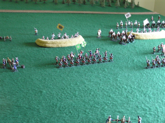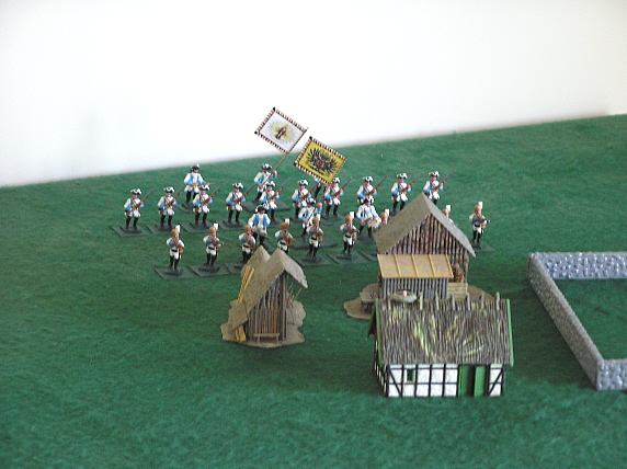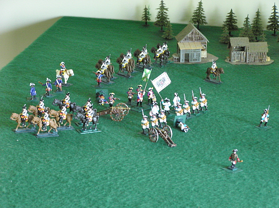 Blown Away Setup - encounter scenario Each side should have the same number of men and artillery pieces, and one commander. Players place 4 objectives, such as a small hill, walled field, bridge, and village, across an 8 foot long table, near the middle. Optimally, each player writes his setup arrangement of troops on a piece of paper before placing them on the table, so that one player is not reacting to the other’s setup. Units may have any number of men in them, but may be of only one type (infantry, cavalry, or artillery). However, different types of infantry may be in the same unit (such as pikemen and musketeers). Officers, drummers, and flagbearers are included as members of a unit. Units of 10 cavalrymen, 4 artillerymen, and 13 infantrymen (10 soldiers plus a command element of an officer, drummer, and flagbearer) work well. Once they are assigned to a unit, men must remain part of that unit for the rest of the game. Units may be placed up to 7 inches from the player’s own rear edge of the table. After setting up, players flip a coin to determine who moves first. Course of play Move or rally, and move commander Turns alternate. Each turn, a player may do one thing. He may move one unit or rally one unit. He may also move his commander any distance. Then he may fire any or all of his long-range artillery. And finally, both players conduct combats with any or all of their engaged units. A player is never required to move, fire, or conduct combat if he does not choose to. Moving Infantry and artillery may move up to 6 inches (exception: artillery prior to 1750 may not move); cavalry may move up to 12 inches. A unit with all its remaining men "in ranks” (not running) may pivot on the center man in the front rank any number of degrees (artillery pivot on the cannon axle), then move forward. A column will follow the front men like a snake, while a line will remain rigid. Units may move obliquely forward up to 45 degrees. They must stop when any of their men are less than 4 inches from, and facing or being faced by, enemy troops. Units may pass closer than 1 inch by enemy troops when neither side is facing the other. Units may pass through friendly troops. A unit may change formation and the direction it is facing, but may not move that turn. A unit engaged in combat with an enemy unit may not pivot or move. Nor may units move if they have both men in ranks and men running. Units with no men still in ranks (all remaining are running) may move in any direction as an unorganized mob up to 18 inches, but may not pass closer than 6 inches from enemy troops. If a unit encounters an enemy unit that has all running men, the running unit is moved away 18 inches by the owning player, and the moving unit completes its move. Running units unable to go the entire 18 inches are eliminated. Rallying A player may rally a unit if 1) it has at least one man remaining in ranks and none are 6 inches or less from any enemy men in ranks who are facing them, or 2) it has no men in ranks and all of its running men are 24 inches or more from any enemy men in ranks facing any direction. In both cases, if the commander is next to the unit the unit may rally up to 6 men. Artillery gunners that have run 6 inches from their cannon return to it when they rally. If they have run farther, after they rally they must be moved back to their cannon, 6 inches per turn, before they can fire it again. Long-range artillery After moving or rallying one unit, the moving player may (if he chooses) fire long-range artillery. Each artillery piece gets 4 cannon balls (represented by markers such as black marbles) at the start of the game. It may fire at any enemy unit in a clear line of sight between 4 and 36 inches away and 45 degrees left or right of its boresight. One man is killed in the target unit. He is put in the storage tray, unless the target unit is engaged in combat, in which case the killed man is left where he fell. No men run when a unit is hit by long range artillery. Only one artillery gunner is needed to fire a cannon. When it fires, the artillery piece eliminates 1 cannon ball marker if the target unit is in the open or in soft cover such as woods; if the target unit is behind a solid wall, eliminate 2 cannon ball markers; if the target unit is behind a redoubt or in a trench, eliminate 3 markers. An artillery piece without enough markers may not fire. Combat In every combat phase both players conduct combats, and all combats are considered to be simultaneous. Combat is between all types of opposing units (infantry, cavalry, artillery) that are less than 4 inches apart, and units may only conduct combat if an enemy unit is in front of them. Each player may choose whether or not to conduct combat with a particular unit of his. Each unit that conducts combat kills one enemy soldier and causes a certain number to run. The player causing the casualties gets to choose which one of the enemy men to kill and which one(s) will run. An infantry unit's command element, consisting of a flagbearer, officer, and drummer, may not be killed or made to run until they are the only ones left in ranks. Of these, the flag bearer must be the last to go. Each unit may only conduct combat once per turn, but a unit can be engaged by more than one enemy unit. Cavalry may not conduct combat against an enemy unit behind a redoubt, wall, in a trench, or in woods. Infantry: One enemy man is killed. Normally, one man runs 6 inches to the rear (and faces to the rear) for each man killed in the fight thus far. So with the first man killed, one man runs; when the second man in the unit is killed, two men run; when the third man is killed, three men run; etc. To keep track, leave killed men on the field until the engagement is over. While engaged in combat with an enemy unit, men killed by long-range artillery are included in the count.