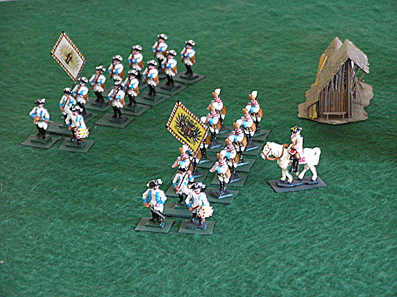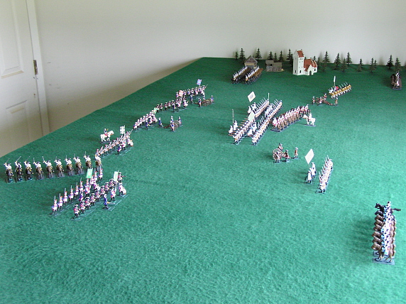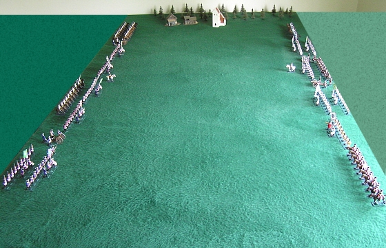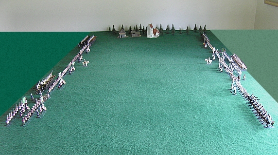 In this battle, Prussian and Austrian armies of the Seven Years War face off on an open field to illustrate the Blown Away rules, without-chance version. The forces are composed of equal numbers and types of troops. The figures are Hinchliffe 25mm.