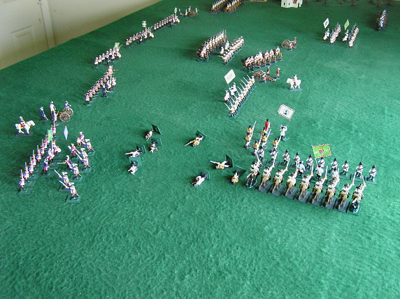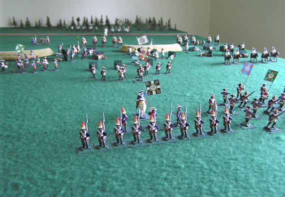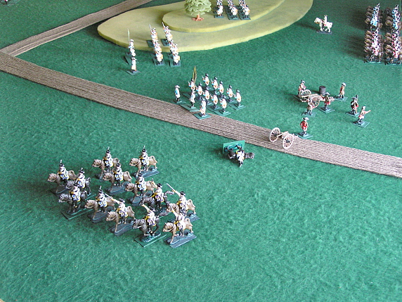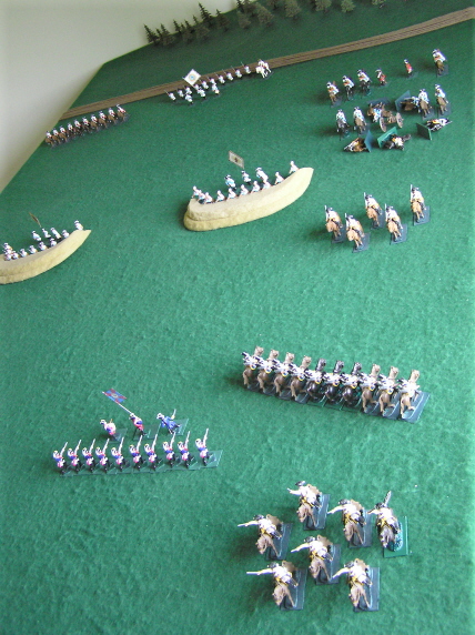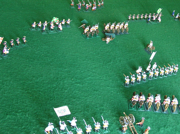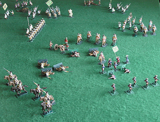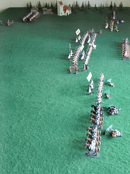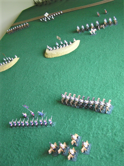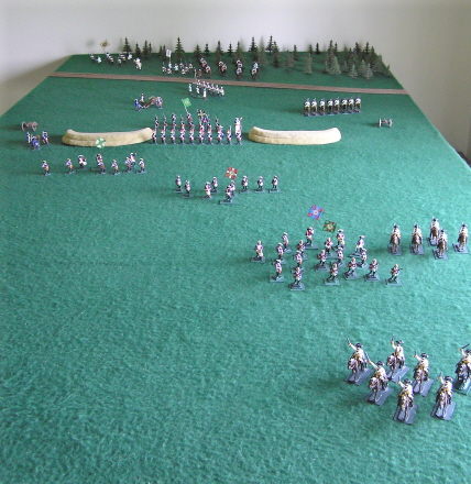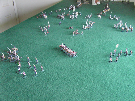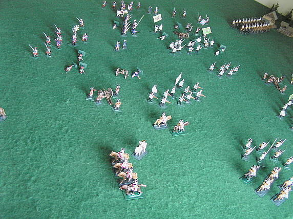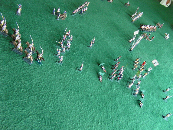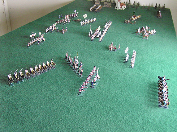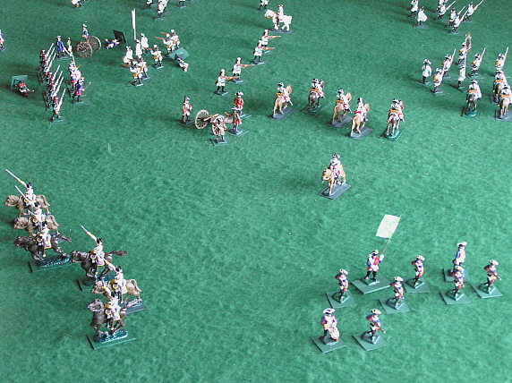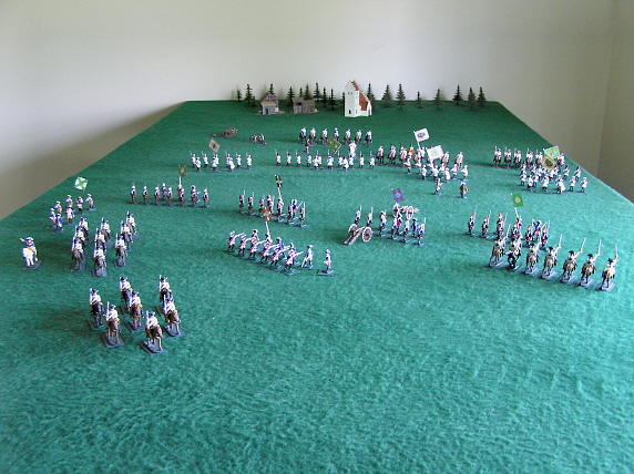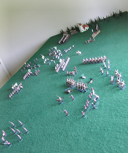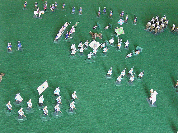 The Prussian commander, Ziethen, has chosen to reinforce his flanks. The Austrian commander, Lascy, strengthened his center. As the armies begin moving, they exchange long range artillery fire. The commanders want to weaken enemy units they intend to attack. Ziethen directs some of his artillery fire against Austrian artillery, a choice he later regrets as wasted shots. Ziethen drives his right wing forward, while Lascy advances his center. The Prussians strike first. They have the advantage of numbers on the flank, and soon units on both sides are melting away under fire. A little overanxious to clear the flank, Ziethen attacks a fresh Austrian infantry unit with cavalry, hoping to follow up with infantry that is still a ways back. But Lascy decides to rally the unit quickly, before the arrival of the Prussian infantry, and so is able to disrupt two Prussian units with it. The Austrian flank forces are gone, but Ziethen has to rally his forces before he can resume the attack. The pause allows Lascy to attack the center. Weakened by artillery fire, the few Prussian infantry units are disrupted by cavalry and infantry attacks. At this point, both sides have many disrupted units. Before continuing, the commanders decide to pull their routing units back far enough to rally them before resuming the fight. Ziethen looks at the situation, and sees that he controls most of the field and still has a small force on the other flank. He intends to drive the rallied units of his right wing as a hammer against the anvil holding his left wing. Lascy is concentrated in the center. He sees an opportunity to crush the isolated Prussian left wing units and then turn on the Prussian right. Both sides begin the second phase of the battle by pushing forward their own artillery to neutralize defending enemy guns. Then both sides advance. Ziethen has so many units to move a long way that overall progress is slow. This gives Lascy time to attack. All the Prussian left wing units are disrupted before any Prussian right wing units make contact. Lascy has succeeded. Without room to fall back, Ziethen must bring the routing units across the field before they can rally. Lascy is able to rally his disrupted units in place, and then begins a general advance against the Prussian right wing. Ziethen sees that the Austrians have more cavalry and infantry units in hand, including the only remaining fresh infantry unit. So Ziethen withdraws, leaving a cannon and the field to Lascy. Casualties on both sides were 31%.