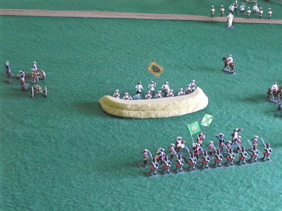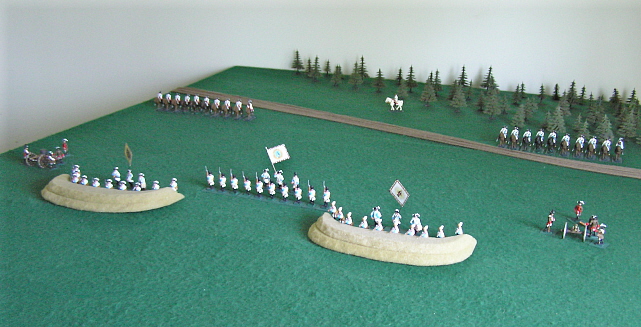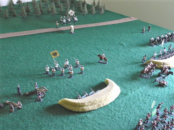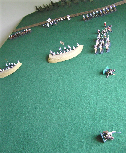 Fieldworks After a day of indecisive battle between large armies, the Prussian commander decides to attack a strong point in the Austrian line the next day. Two redoubts protect a lateral communication road where it passes near the front line. Cutting this road will divide the Austrian force and make it easier to defeat. The Prussian commander has placed most of his reserves under General Tresckow. They are to assemble before dawn, attack at first light, and cut the road before the defenders can be reinforced. As the early morning mist rises from the field, Tresckow leads forward a force of 6 infantry and 3 cavalry units plus 2 cannon. Ahead of them are the redoubts, earthen fieldworks for the protection of defending infantry or cannon. There are 3 infantry and 2 cavalry units plus 2 cannon under General Beck. Beck quickly realizes he is heavily outnumbered, and dispatches a courier for reinforcements. Tresckow halts his force just outside artillery range. Tresckow pushes his two cannon forward to engage the western Austrian gun. They knock it out with minimal Prussian casualties. Beck pulls his exposed grenadier unit back from the center out of artillery range. On his left, Tresckow advances 2 infantry units and a cannon. On his right, he launches 2 cavalry units in column towards the eastern Austrian cannon, and 2 infantry units begin a slow march towards the east redoubt. The first Prussian cavalry unit charges the cannon, losing 2 riders to long-range fire. They are easily repulsed by the Austrian gunners. Undeterred, the second Prussian cavalry unit charges forward. The second cavalry unit also loses 2 riders to long-range artillery fire, but manages to get in among the Austrian gunners to cut them down. In response, Beck throws his left cavalry unit at the Prussians. After a spirited skirmish, the Prussian cavalry is routed. Tresckow sends his third cavalry unit to his right to cover the advancing infantry. Beck rallies his cavalry. They hold the line, but the artillerymen cannot rally to the gun because an in-ranks enemy unit is too close. Both Austrian cannon are out of action. Without pausing to rally his cavalry, Tresckow marches 4 infantry units towards the redoubts. Beck can only watch and wait, hoping the Prussians shatter themselves on the fieldworks. And that is what happens to the first Prussian unit at the west redoubt. But despite the odds, at the east redoubt the Prussians give as good as they take. In the end it is a draw; the east redoubt has been cleared, and the Prussians prepare to occupy it. Tresckow moves his cavalry unit up to prevent the Austrian cavalry from engaging the fusiliers, and orders one of his 2 reserve infantry units forward. Beck launches both his reserve units at the east redoubt to prevent its capture. The Austrian cavalry plow into the fusiliers, and begin to get the upper hand. The Austrian grenadiers approach the redoubt. The Prussian fusiliers fight hard but are defeated. The Austrian grenadiers re-occupy the east redoubt as the reserve Prussian infantry unit arrives on the scene. Beck rallies his victorious cavalry unit on the spot. But Tresckow sees that the Austrians have committed their last reserves; the west flank is open. He pushes his lead cannon through the opening. The Austrian infantry in the west redoubt dare not maneuver to meet the threat; the Prussian Frei-Corps Kleist infantry would hit their flank. The Prussian reserve infantry unit engages the Austrian cavalry unit, assisted by long-range fire from the rear Prussian cannon. Once behind the redoubt, the Prussian cannon unload two long-range shots into the Austrians, then move in to cannister range. One close shot in the rear sends the Austrian infantry in the redoubt running. Tresckow moves the Kleist infantry forward. With the loss of the west redoubt, the Prussians will be able to roll up the Austrian line. Beck gets a message that reinforcements are on the way; he just needs to hold out for a while longer. He sends his grenadiers over the top of the redoubt into the reserve Prussian infantry, already engaged with the Austrian cavalry. The Prussian infantry begins to falter. Beck orders the cavalry on his left to charge the Prussian cavalry. Beck is all in. The Kleist infantry turn away from the west redoubt and into the flank of the Austrian cavalry. The battle now hangs in the balance with a confused melee. The Austrian grenadiers succeed in routing the Prussian reserve infantry. However, both Austrian cavalry units are routed. Beck wants to rally the infantry from the west redoubt, but the Prussian cannon advances to prevent this. So he orders his rallied infantry, who earlier held the east redoubt, to attack the artillery. Tresckow leads his last intact reserve unit forward, the grenadiers. To everyone's surprise, the Kleist Frei-Corps infantry defeat the embattled Austrian grenadiers. Nothing remains of the Austrian line. Tresckow rallies his successful cavalry unit. Routing Prussian infantry and cavalry units are all over the field. Yet the Prussians held such an advantage in numbers that enough remained to break the Austrians. Tresckow rallies the Kleist infantry, and pushes the cavalry and grenadiers forward in pursuit of the Austrians. Beck abandons the attack on the Prussian cannon, and leads his fleeing forces to the west. He looks forward to having a few words with the commander of the reinforcements. Both sides lost a similar total number of men. However, there were fewer Austrians on the field, so their casualties were 43% while Prussian casualties were 26%.